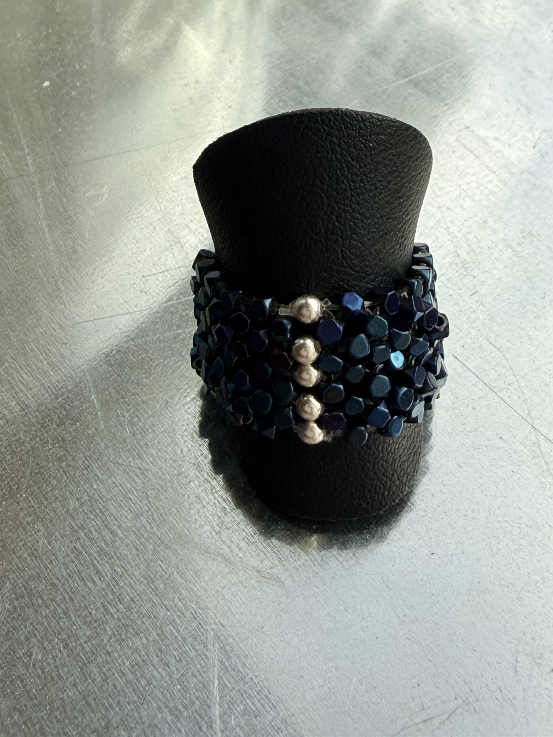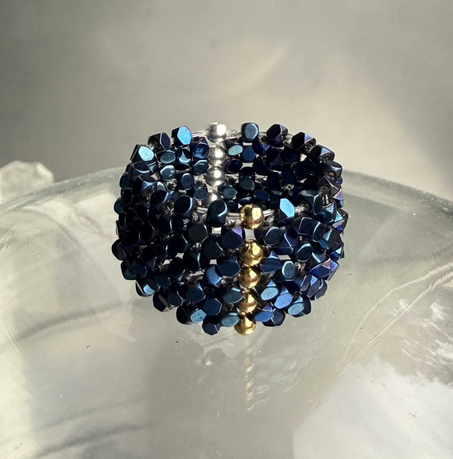 Brede stretch ring van hematietstenen (cubes). afgewerkt met 5 zilveren en 5 goud(platen)pareltjes. Geregen op stevig juweliers elastiek, middels patroon. 2 kanten draagbaar maar ook alleen hematiet.