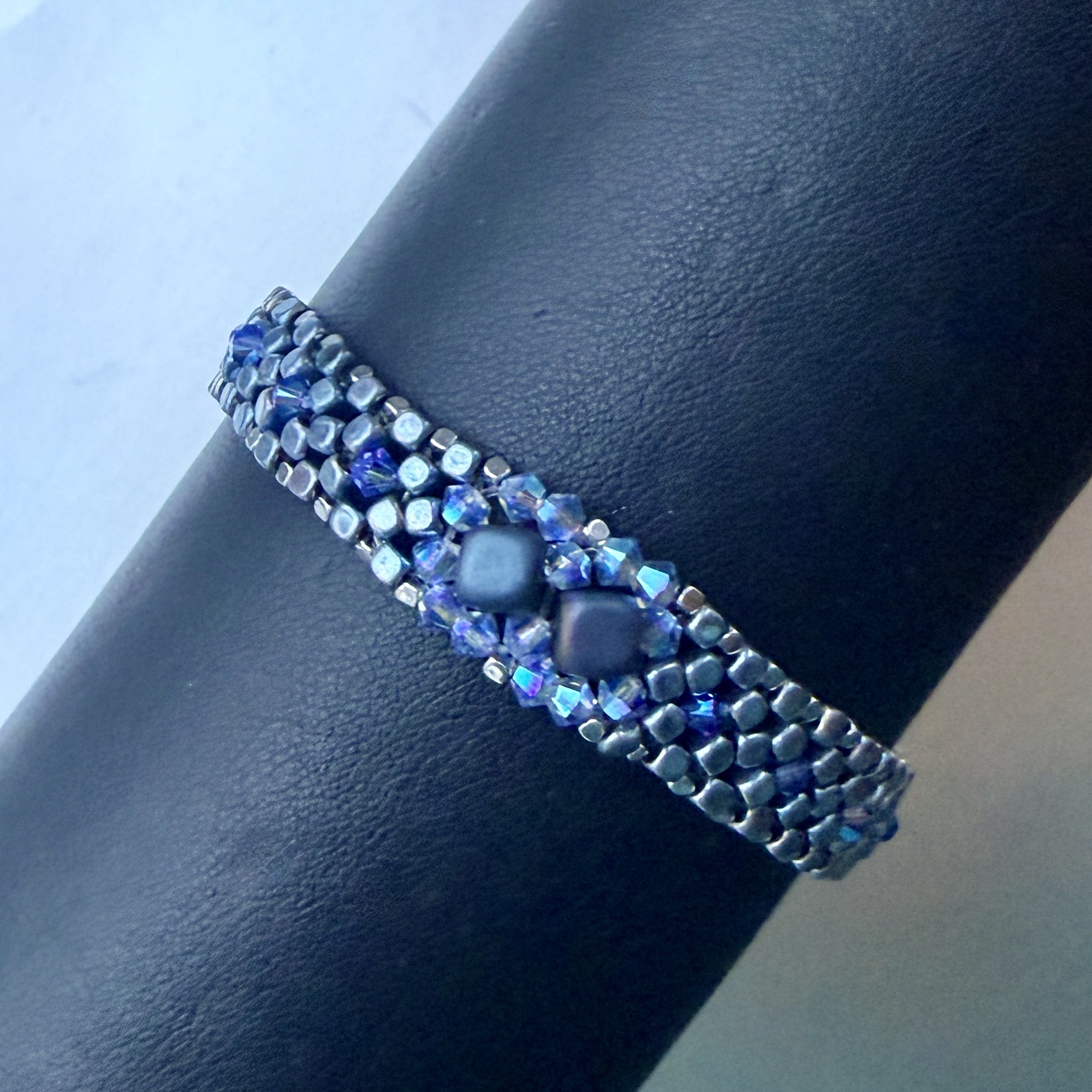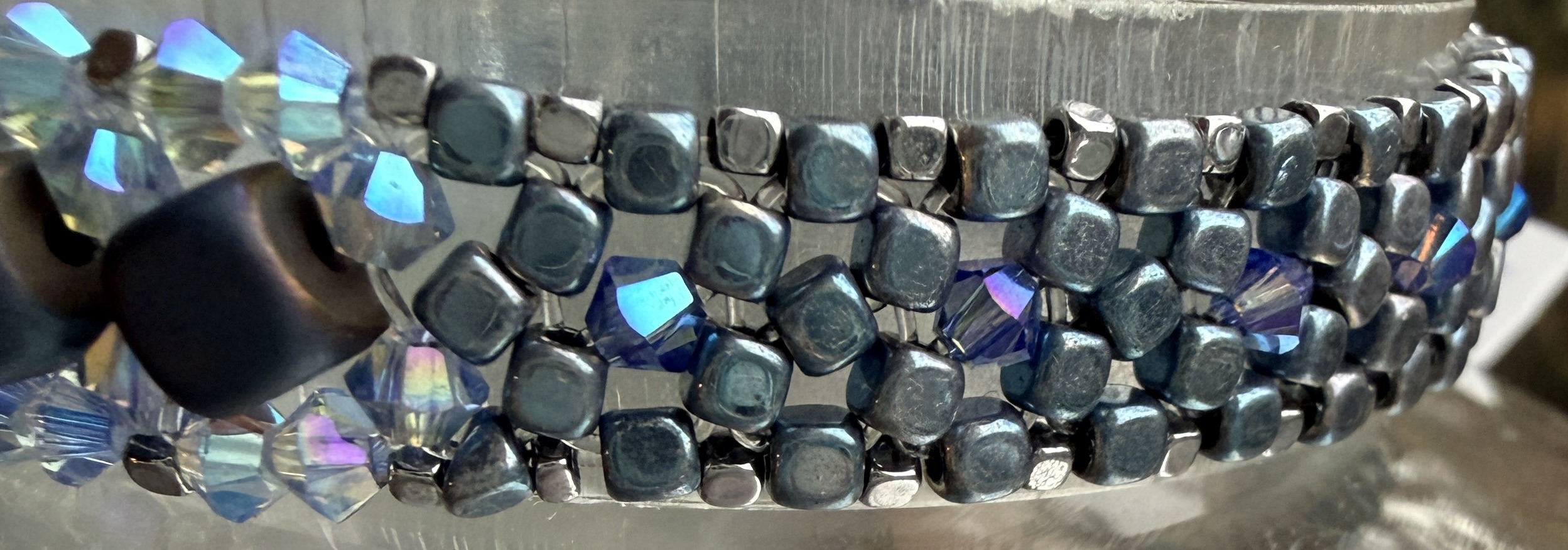 Geregen op stevig juweliers elastiek, in patroon. Naar eigen ontwerp en met de hand vervaardigd.
