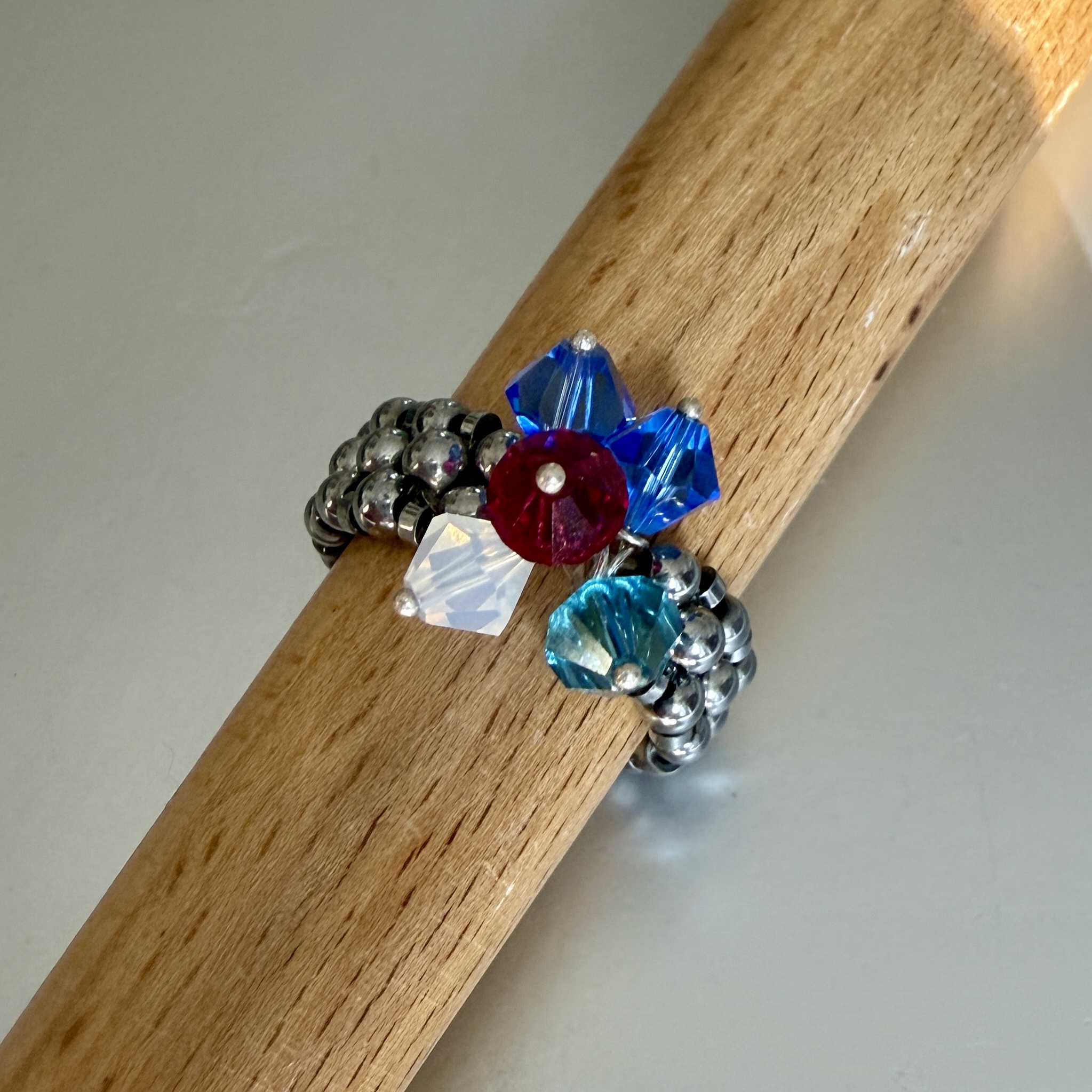 Unieke stretch-ring van Hematietstenen en Swarovski crystallen in verschillende kleuren.